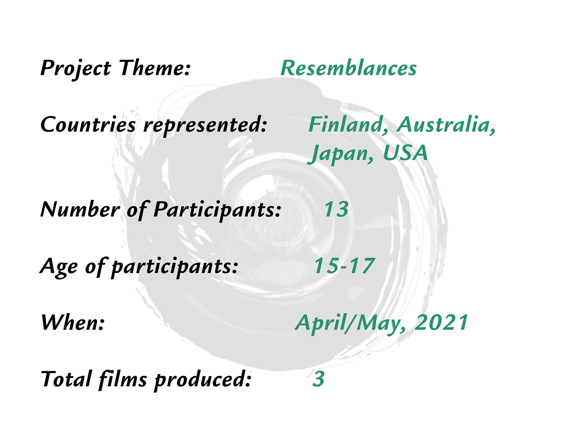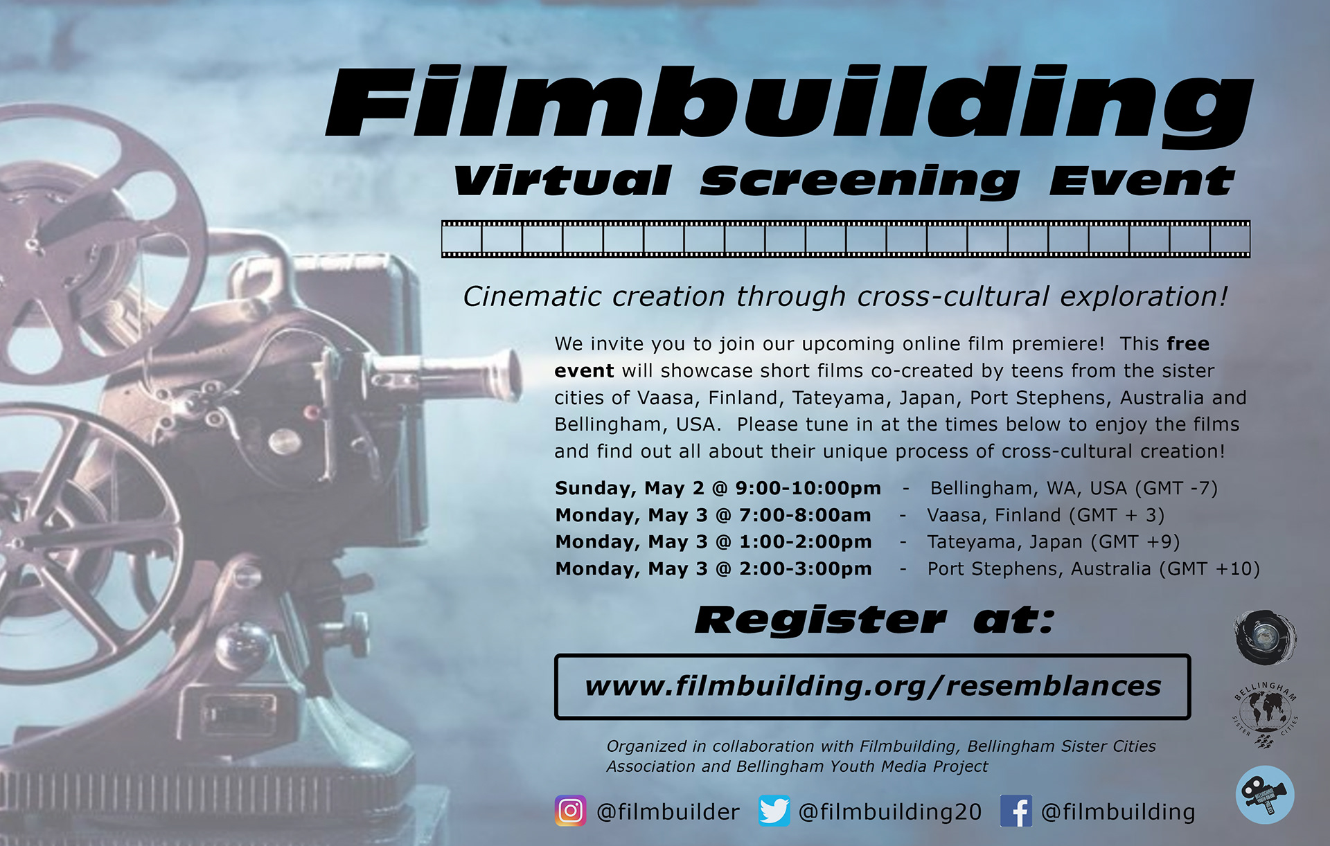 In collaboration with the Bellingham Sister Cities Association of Bellingham, WA, this workshop brought together students from four different sister cities - Vaasa, Finland, Port Stephens, Australia, Tateyama, Japan and Bellingham, USA to explore the theme of "Resemblances." The success of this workshop proves how collaborative, cross-cultural storytelling can help us strengthen diplomatic ties as well as personal ones.